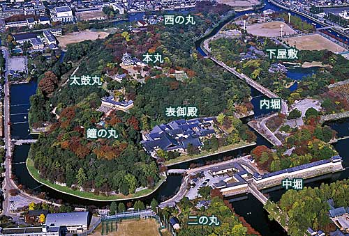 天守が立つ本丸が置かれた「第一郭」には家臣団筆頭の屋敷が配置されました。内堀と中堀に挟まれた「第二郭」(二の丸または内曲輪)には、第一郭に続く重臣の屋敷が軒を並べました。中堀と外堀に挟まれた、「第三郭」(外曲輪)は武家屋敷と町民屋敷が建ち並んでいました。